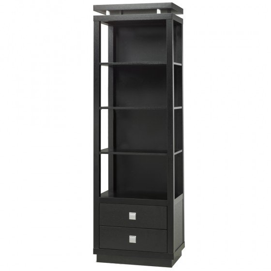 Enjoy movie nights even more when your entertainment center is clutter-free with this stylish black pier. With three shelves, a lower tier and two drawers, you’ll have plenty of space to hide away any unnecessary clutter while keeping selective decorative essentials on display. Pair this with the matching black TV Stand (Model #14856 or #14857) to complete the look! **** Available in black with chrome accents and hardware.