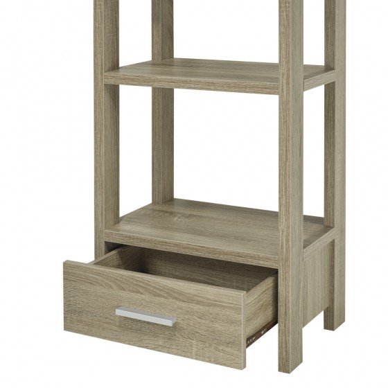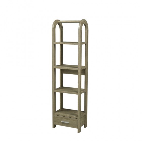 With soft curvature at the top of this multi-shelved display stand, you can easily add a feel of traditionalism to your modern d?cor. The clean lines and rectangular shelves offer an uncluttered look and feel, allowing your artwork, photographs and decorative elements shine. A lower drawer offers space to neatly store small items like coasters and napkin rings. **** Available in black, white & dark taupe.