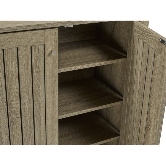 This uniquely designed cabinet holds up to 12 pairs of shoes! Multiple shelves keep your shoes neatly organized and stylishly concealed behind rich, multi-tonal slatted doors. The cabinets top also offers a place for some decorative items like plants, or for functional storage such as a key box.