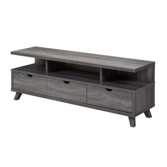 With both fashion and function in mind, this contemporary TV stand easily accommodates flat panel TVs up to 60 inches while adding a touch of refined style to any room. The stand features a raised top and flared legs that add character to the straight profile. A luxurious, dark grey finish gives it an air of sophistication and seamlessly complements existing furniture pieces. The spacious top offers room for d?cor items while three open shelves and three drawers provide ample space for media components and accessories, allowing you to store clutter out of the way. An elegant addition to your living space, the stand enhances your entertainment area and is sure to impress.