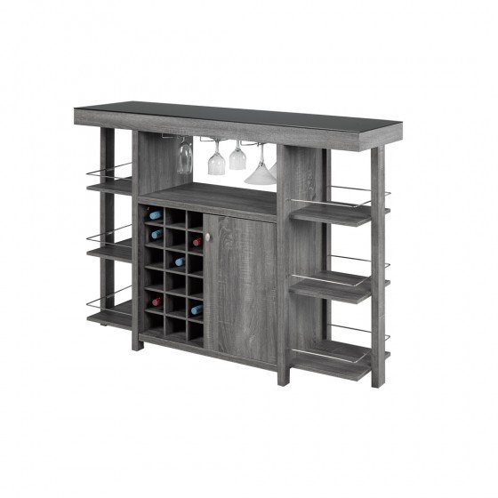 Rich, neutral tones are complemented by straight, clean edges making this freestanding bar unit the perfect modern addition to your entertaining space. From top to bottom, it offers practicality with loads of storage and display possibilities. The tempered, smoky black glass top is ideal for pouring drinks while entertaining. Below it, multiple inverted racks are great for hanging wine and martini glasses securely yet within easy reach; and six shelves are highlighted with chrome-finished ledges. The unit it grounded with its center console providing ample space for up to 15 wine bottles and a cabinet for even more bottles of your favourite spirits.