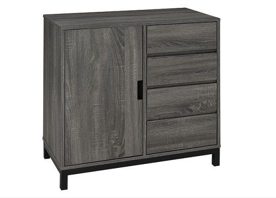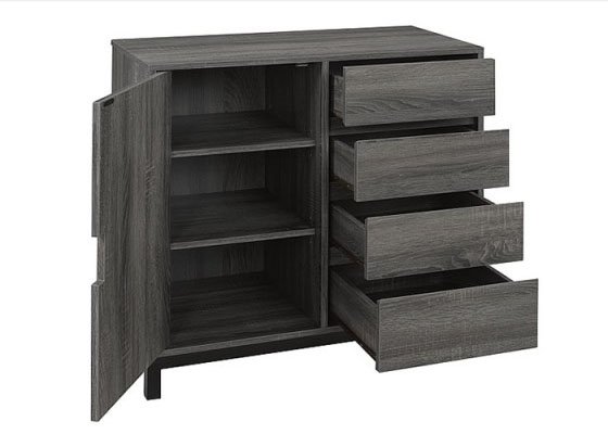 Simplicity in design can make just as big of a style statement as an elaborate pattern can. With an understated boldness, this buffet stand brings chic sophistication to any dining space. Grey wood veneer, black hardware and flush-panel design make this stand appeal to those who want a clean, streamlined look. Its smart style also comes with smart functional design; four drawers and a full size main cabinet offer plenty of space to neatly store entertainment essentials, such as bottles, glasses, dishes, cutlery and serving utilities. The tabletop can be used as a server or to prepare drinks on top, and the wood veneer can be easily wiped clean to maintain its handsome style.