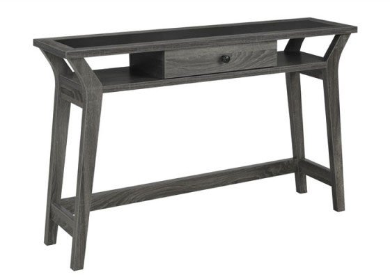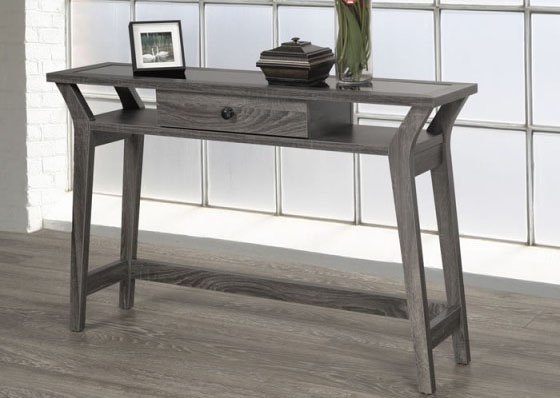 Add stylish storage and display space to an entryway, living room or study with this elegant console table. The eye-catching design features a splayed leg base that provides stability and a sleek, modern look. A convenient storage drawer provides space for keeping writing instruments, mail, keys and other small items neatly tucked away. Two open storage shelves give you even more room for displaying small useful or decorative pieces. The vintage grey color is a versatile option that will fashionably impact any interior.