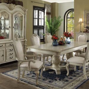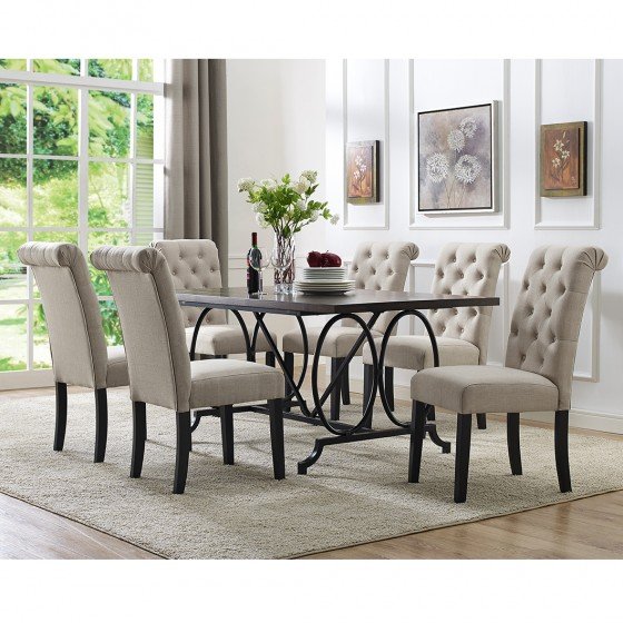 Elevate the look of your dining room with the comfortable sophistication of the Tinga dining series. This attractive seven-piece dining set consists of six dining chairs and one dining table. Rubber wood construction and webbing seat structures ensure the durable and comfortable chairs stand up well to regular use, while the comfortably cushioned seats and backs are covered in a neutral beige 100% polyester fabric that is easy to clean. Classic tufted accents on the seatbacks complement the gently rolled tops, adding to the elegant look. Enjoy memorable meals with family and friends around the impressive table with its chic elm veneer top and sturdy steel base. Eye-catching circular details and a rich baking paint finish make this table a sophisticated standout in any home.
