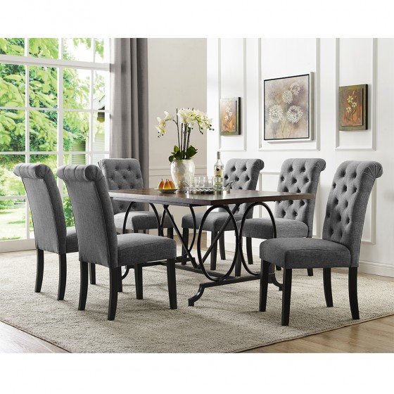 Elevate the look of your dining room with the comfortable sophistication of the Tinga dining series. This attractive seven-piece dining set consists of six dining chairs and one dining table. Rubber wood construction and webbing seat structures ensure the durable and comfortable chairs stand up well to regular use, while the comfortably cushioned seats and backs are covered in a neutral grey 100% polyester fabric that is easy to clean. Classic tufted accents on the seatbacks complement the gently rolled tops, adding to the elegant look. Enjoy memorable meals with family and friends around the impressive table with its chic elm veneer top and sturdy steel base. Eye-catching circular details and a rich baking paint finish make this table a sophisticated standout in any home.