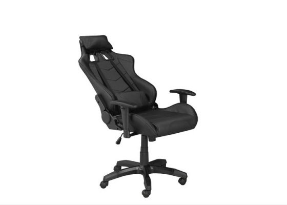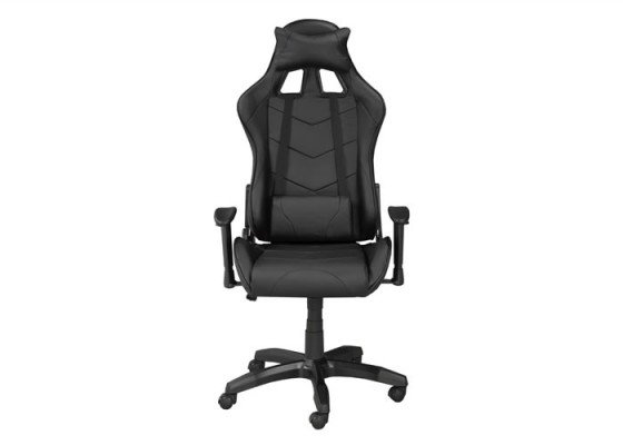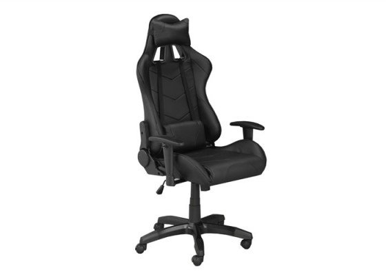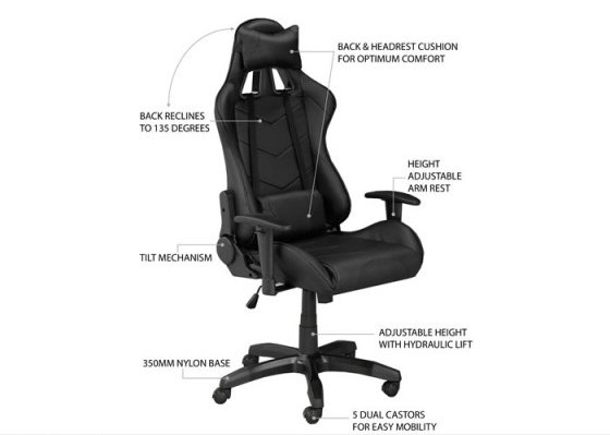 Take your game to the next level with this sleek and stylish professional gaming chair. The ergonomic design ensures lasting lumbar support with an included pillow and cushion for added comfort. A tilt mechanism, hydraulic lift, 135 degree recline function and adjustable armrest heights help you to maximize your gaming performance with custom comfort. This streamlined chair sits on a stable 350mm nylon base with five dual castors that allow for easy mobility. The durable and easy-to-clean surface features a bold midnight black color scheme youre sure to love.