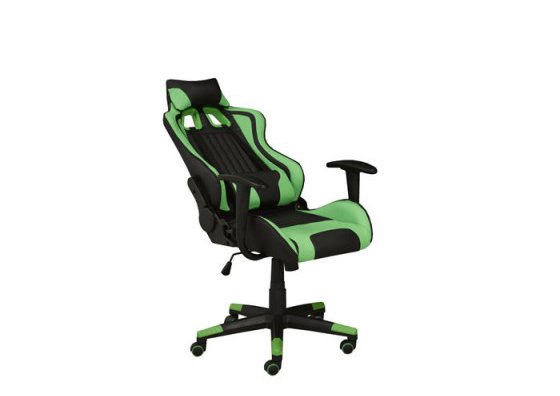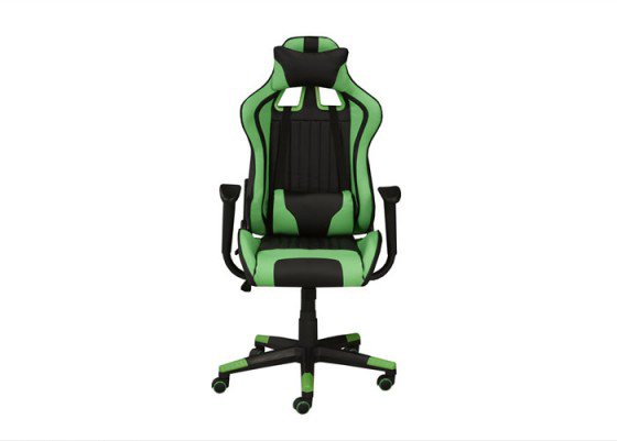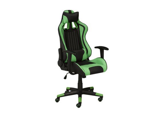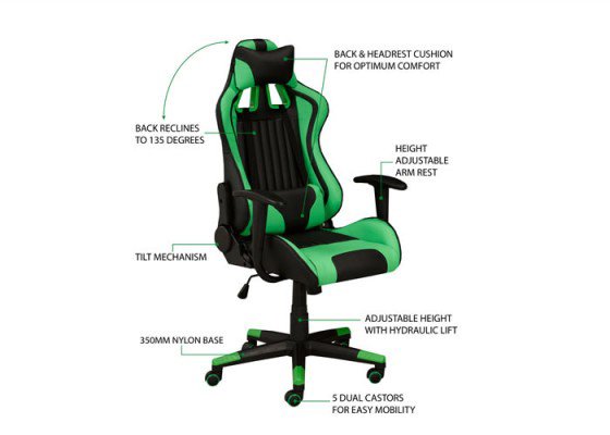 With its bold black and green color scheme, this streamlined professional gaming chair is ready for action. The ergonomic design can recline up to 135 degrees and includes a pillow and cushion to keep you comfortable during marathon gaming sessions. Equipped with a tilt mechanism and hydraulic lift, this gaming chair can be easily positioned for custom comfort to help maximize your gaming performance. The durable 350mm nylon base provides stability and is fitted with five dual castors for ease of movement.