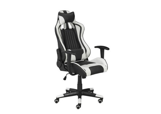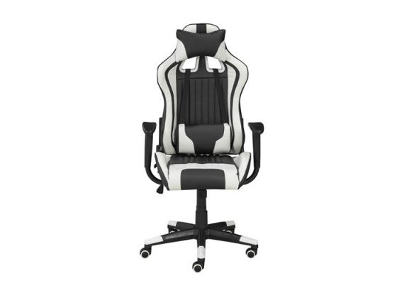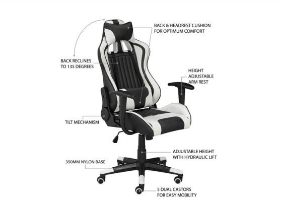 With its bold black and white color scheme, this streamlined professional gaming chair is ready for action. The ergonomic design can recline up to 135 degrees and includes a pillow and cushion to keep you comfortable during marathon gaming sessions. Equipped with a tilt mechanism & hydraulic lift , this gaming chair can be easily positioned for custom comfort to help maximize your gaming performance. The durable 350mm nylon base provides stability and is fitted with five dual castors for ease of movement.
