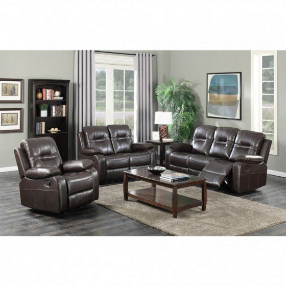 The Napolean recliner series features a solid frame with soft foam padding, all wrapped in highly breathable aire-leather upholstery. The sleek chocolate fabric features strategically placed accent stitching to add visual interest. With an overstuffed appearance with extra padding in the armrests and headrest, the sofa, loveseat and chair are ideal for those seeking the ultimate in comfort. The chair also comes with a durable gliding system, for added enjoyment. All pieces come with full extension, high quality reclining mechanisms, making them strong enough to withstand the rigors of daily use.