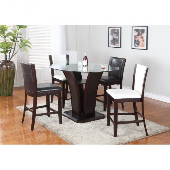 7154 Style and substance collide beautifully with the chic Ambrose dining series Featuring an archly toned espresso wood base that gives the illusion of height and supports a tempered glass tabletop. Elliptical lines keep the look clean and refined, while the contrasting elements lend subtle brilliance to your space. The coordinating chairs are designed to provide lasting comfort, with their smooth seats, sleek upholstery and curved backs. Well-appointed and built with high-grade materials, this dining series is one that will complement any modern space.