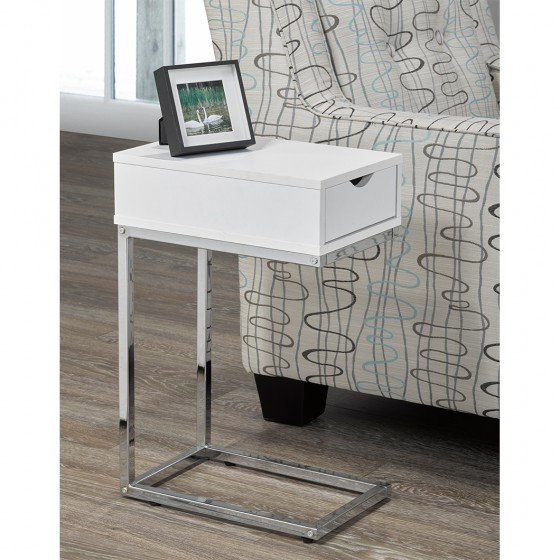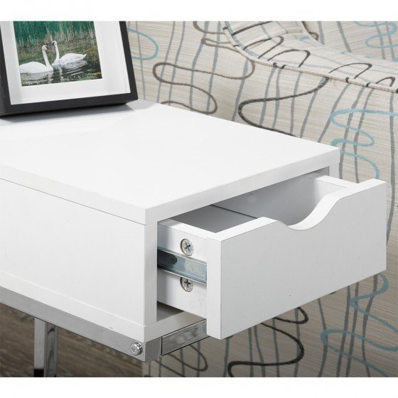 Versatile in design, this side/accent table combines modern styling with handy everyday storage. The contemporary table features a white storage drawer set upon a minimal chrome frame for a bold look. Place d?cor items, framed photos and other knick knacks on the table top for display or use it as handy extra surface space for beverages and snacks. At the same time, you can store remote controls and other items in the drawer and out of the way when not in use to keep the room uncluttered. Crafted for durability, this accent table features an MDF table top and sturdy metal frame for stability that goes hand-in-hand with its functional design