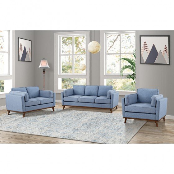 Add a touch of contemporary style to your living space with the Jaxson three-seater sofa. The understated sofa features square arms and clean lines for a streamlined look. Sleek splayed legs and a chic blue fabric cover bring an eye-catching element to the minimalist design, making it a stylish addition to your living room. Designed for comfort and durability, the sofa offers ultra-comfortable seating you’ll sink into and a solid wood frame for lasting reliability. Pair it with a matching love seat and chair or use it as a striking standalone piece to complement your existing d?cor