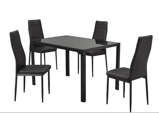 Add chic, contemporary style to your kitchen with this elegant Lucca 5-piece kitchen set. The attractive set features a rectangular table and four armless chairs ideal for family gatherings and casual get togethers. Built to last, the table has a sturdy solid metal frame and tempered glass tabletop, while comfortable, curved high-back chairs are finished with durable full-leather fabric covers. The metal, glass and leather materials combine to create a striking modern appearance. With its slim profile and clean lines, this kitchen set delivers a sleek look that adds cool sophistication to any kitchen or breakfast room.