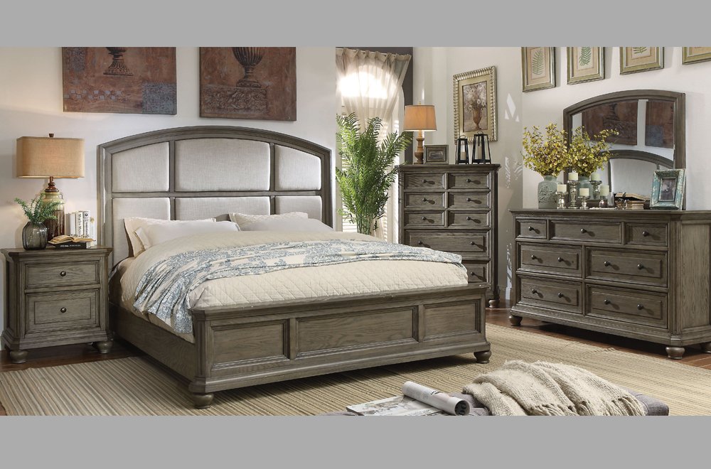 Contemporary meets classic in this beautiful bedroom set, designed to make an impact. Night stands include 2 USB ports to ensure your phone and other devices is always charged, as well as 2 power outlets. Dresser and chest has loads of storage, and the dresser includes felt-lined top drawer. Headboard and mirror have matching curved design.? Slats included. Box spring required. Distressed grey finish.