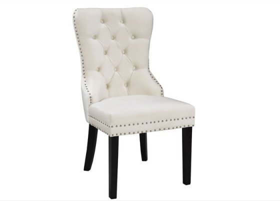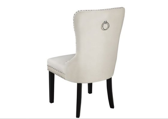 The Verona dining chair is a welcome addition to any chic dining space. The elegant but durable polyester fabric features a luxurious velvety finish for an inviting look and feel. Traditional tufted accents on the comfortably cushioned seat back are a handsome complement to the sophisticated and sturdy nail-head trim. A convenient chrome-plated pull handle on the back adds modern appeal and makes it easy to re-position this dining chair as needed. With its fashionable neutral cream color and dark wooden legs, this versatile chair fits seamlessly into any contemporary or traditional d?cor scheme. Group multiple Verona dining chairs around a table to create an elegant dining set or place them individually around your home as accent pieces or for extra seating when entertaining.