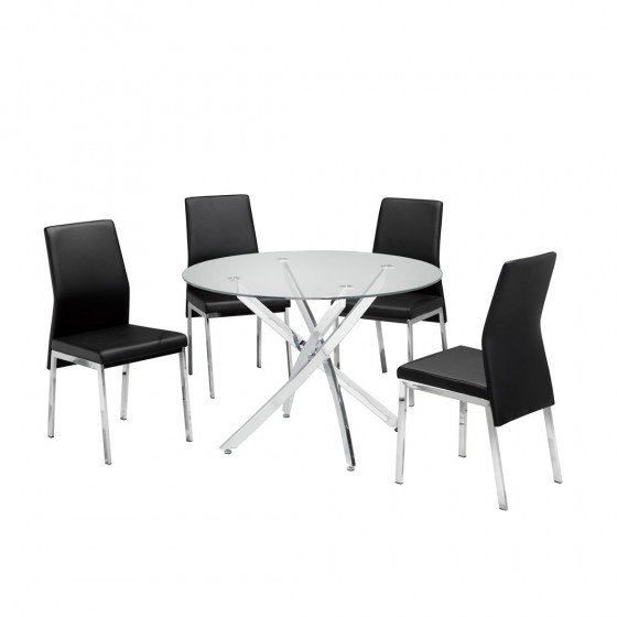 Instantly elevate the look of your kitchen or dining room with the contemporary Meredith kitchen set. Whether you’re enjoying family dinners or entertaining friends, this sleek five-piece set provides a comfortable seating and dining area and includes a table and four chairs. The elegant table takes center stage with a sturdy 12mm tempered glass top and eye-catching modern chrome plated legs. Covered in an easy-to-clean, neutral espresso colored fabric, each of the four chairs offers comfortable padded seating with a fashionable curved seatback design. The chic chrome plated legs of the chairs coordinate with the table base for a clean, modern aesthetic that works effortlessly with most color schemes.