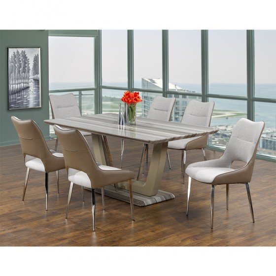 Style and substance collide beautifully with the chic Leonardo dining series. The table showcases a rich MDF constructed tabletop, supported by eye-catching curved double pedestals in popular contrasting colors. Sitting atop chrome finished legs, the chairs are expertly upholstered in rich durable faux leather wrapping the contoured seats and chair backs in an effort to express comfort and modern beauty in one breath. Once its all together, you get a stunning dining set built with enduring quality and long-lasting comfort in mind.