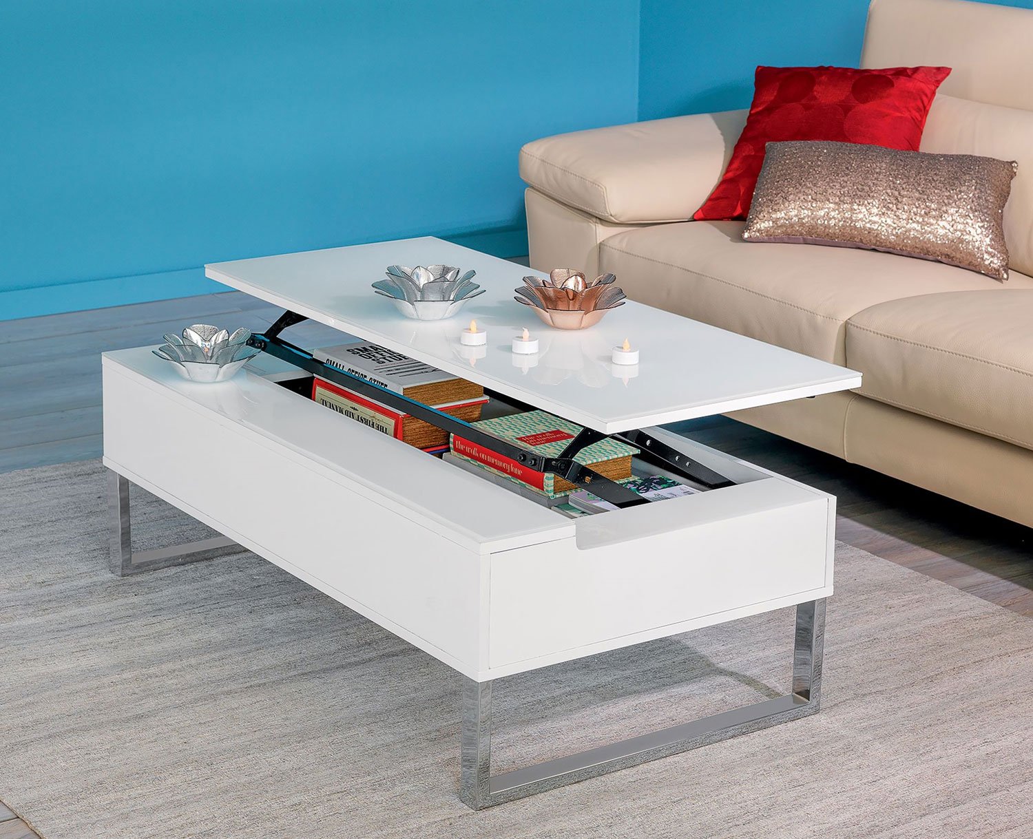 White high gloss lacquer table top with metal tube chromed leg equipped with top Lift Up mechanism.