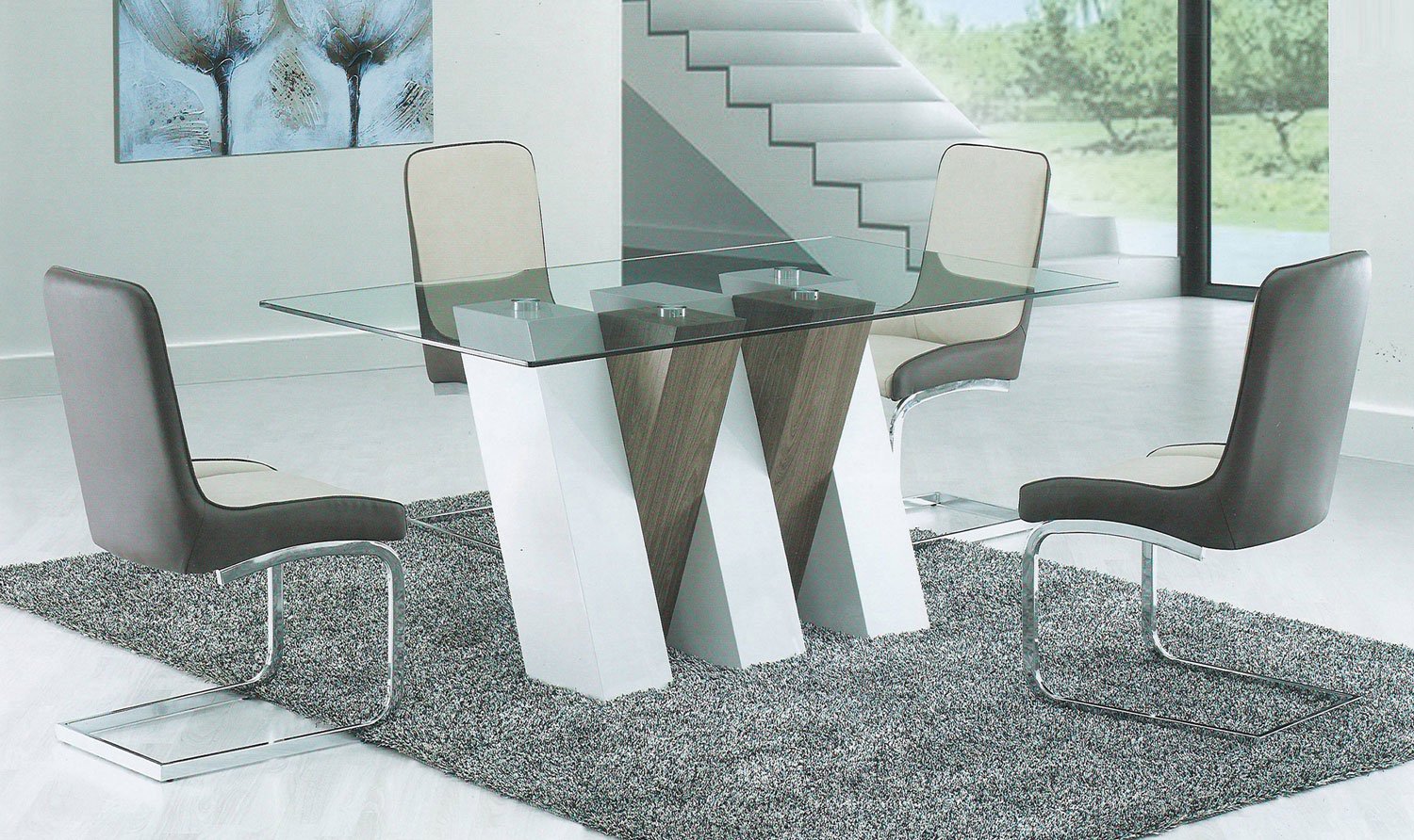 Jazz Dining Table Clear Tempered glass table top and White high gloss & Brown wood veneer legs. Category: Dining Table Set Additional information Additional information Brands Creative Home Decor Related products 1520-DINETTE Read more 9 Pc Dining Set Read more 9 Pc Dining set Read more 9 Pc Dining set with fabric chair Read more