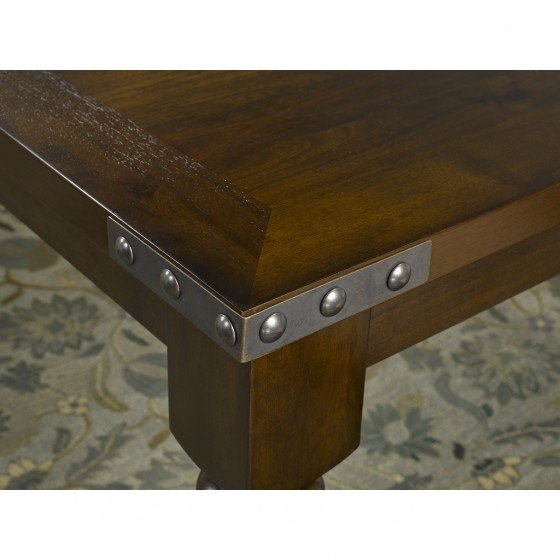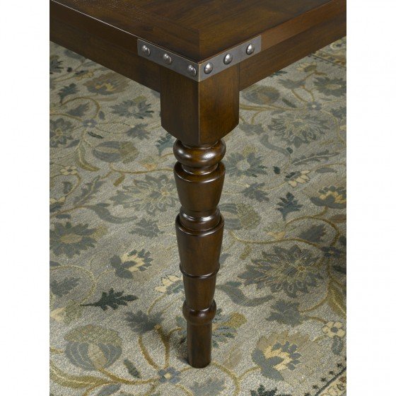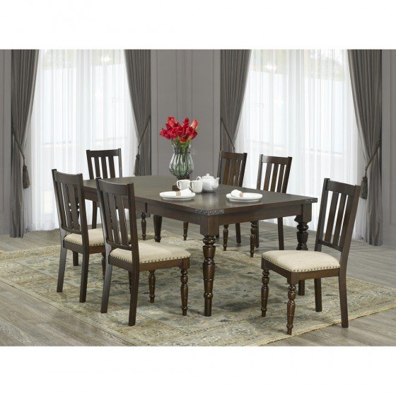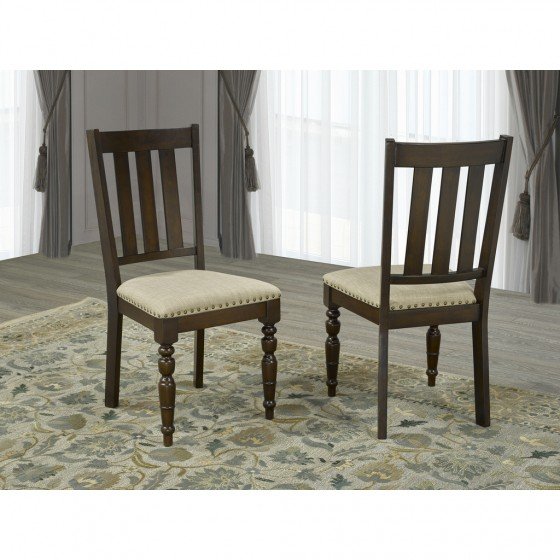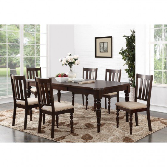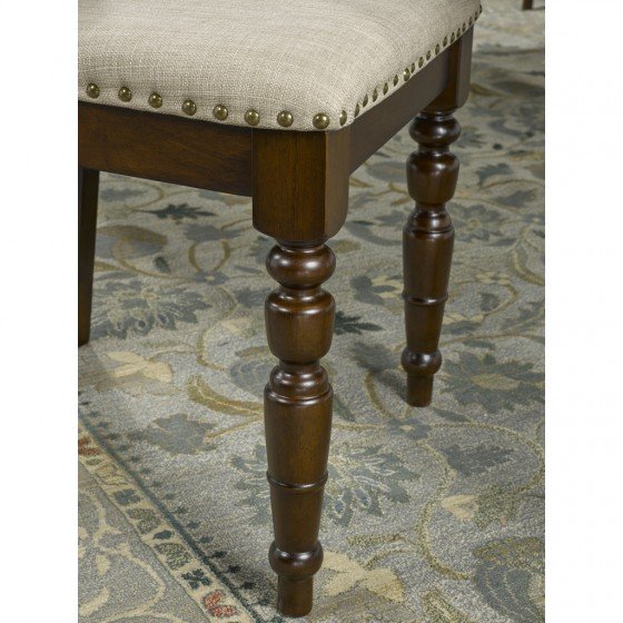Within all of the elegance is a touch of modern flair; a combination that makes this dining set a versatile addition to nearly any existing d?cor. Carved detailing on the legs is beautifully contrasted by the industrial style of nail-head trim accents. Its solid structure and fabric-wrapped, cushioned seating offer you a place to enjoy many meals in lasting comfort.
