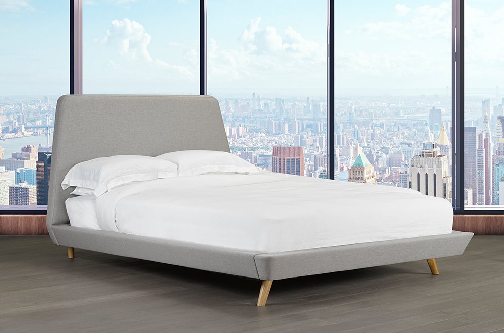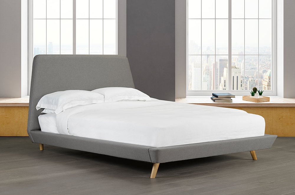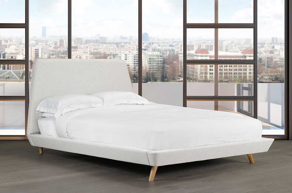 Sleep in style with this Scandinavian design influenced, low profile, upholstered bed. The angled headboard, wide rails and angled wood legs offer an unique aesthetic.