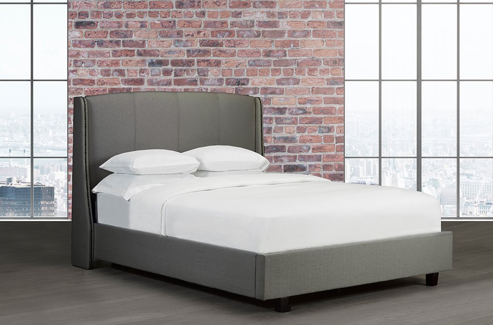 A beautiful headboard, inset in-between two wings, boarded with nailheads, this custom upholstered headboard offers a dramatic look that elevates the style of any bedroom.