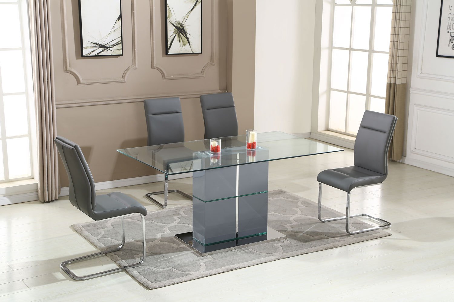Table top made of tempered clear glass, middle leg made of Grey High gloss with stainless steel decoration and base plate in shinny stainless steel.