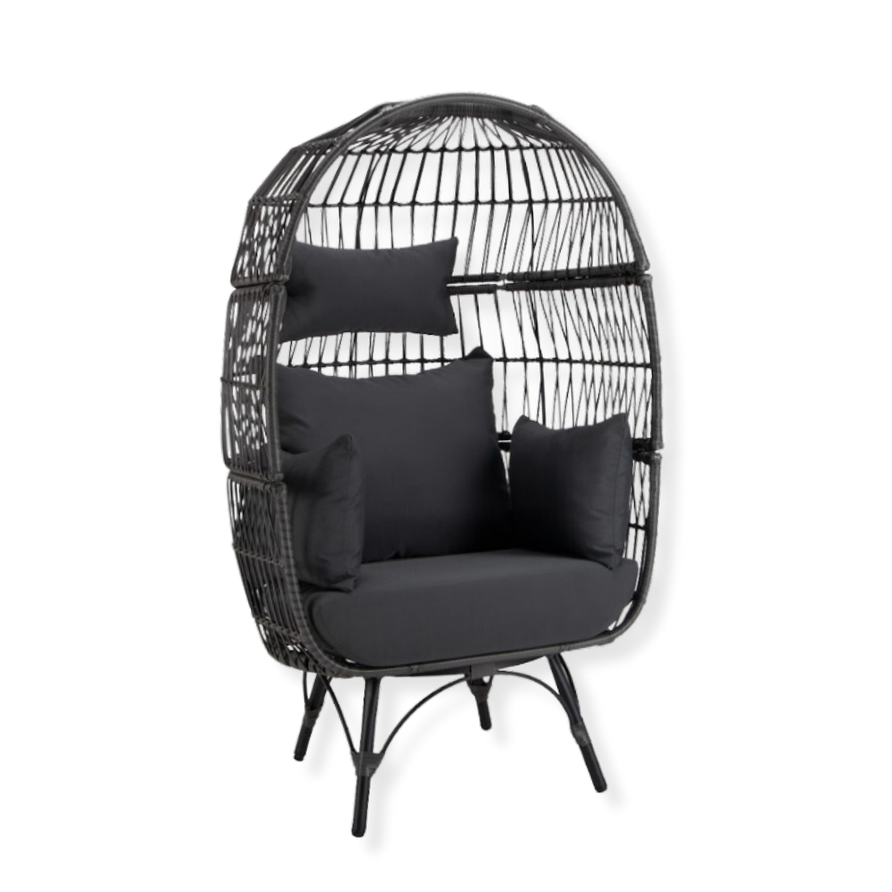 Experience ultimate relaxation with the Standing Egg Chair, featuring a foldable PE rattan basket and thick memory foam cushions. Designed for indoor or outdoor use, its sturdy black powder-coated frame supports up to 440 lbs. Cushions are removable and water-resistant for easy care. Minimal assembly required.