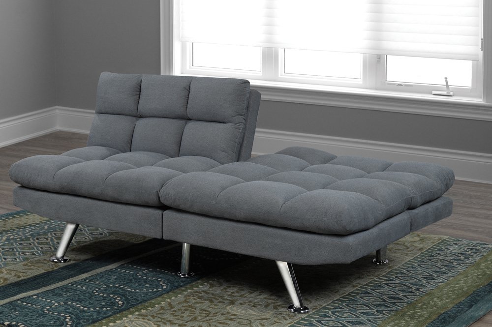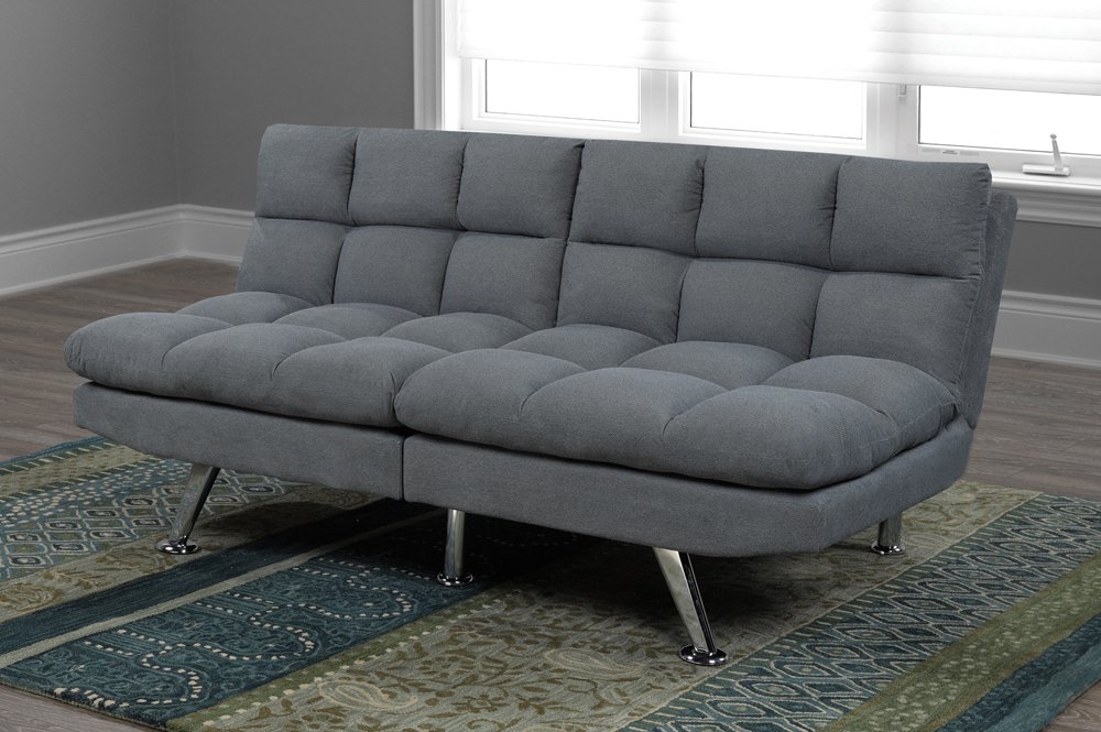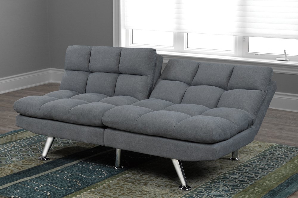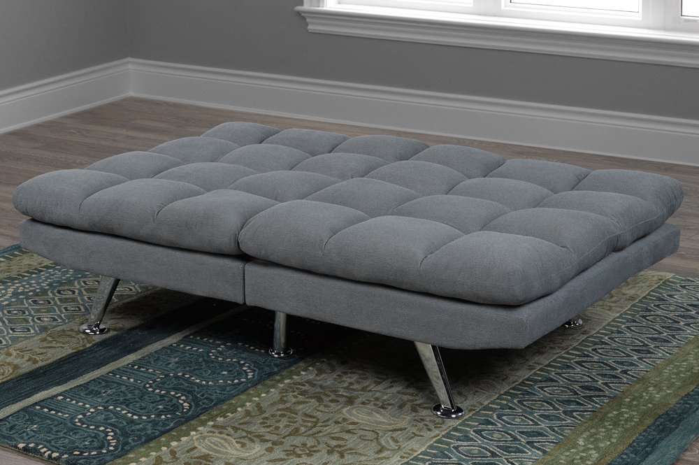 This klick klack includes multi-functionality for even greater value. The lush cushioning, with tufting offer immense comfort, while the grey, linen-style fabric and chrome legs makes for a perfect, neutral addition to any room. Klick klack includes dual adjustable backs, and can open to both a lounge mode, and full-size sleeping area.