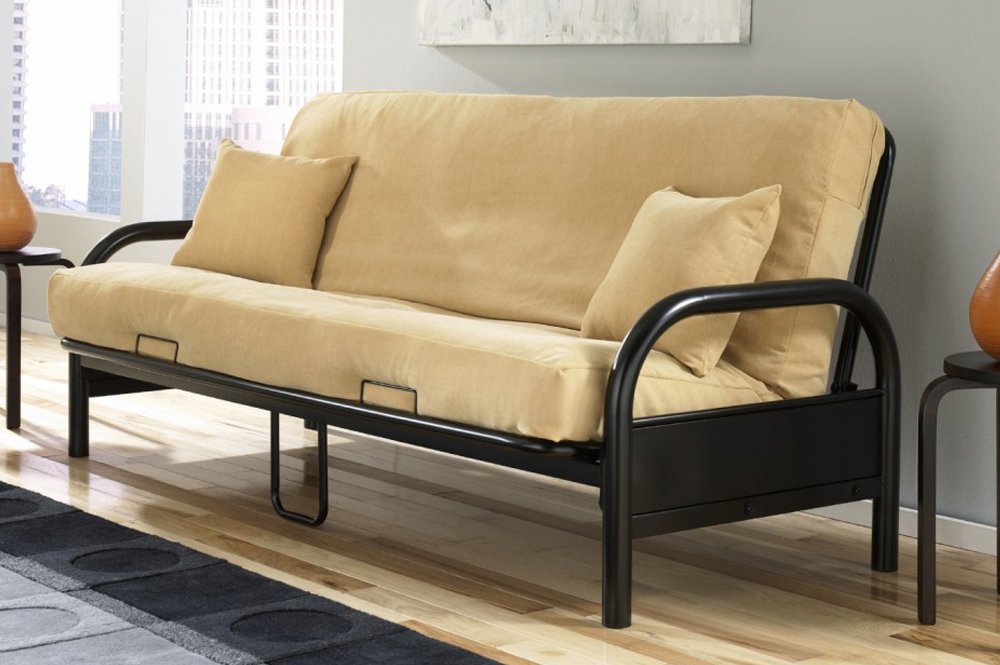 This Black metal futon looks great in just about any room in the house. Canadian made Futon Mattress. Black frame. Mattress colour options: Black, Blue, Burgundy, Green, Tan.