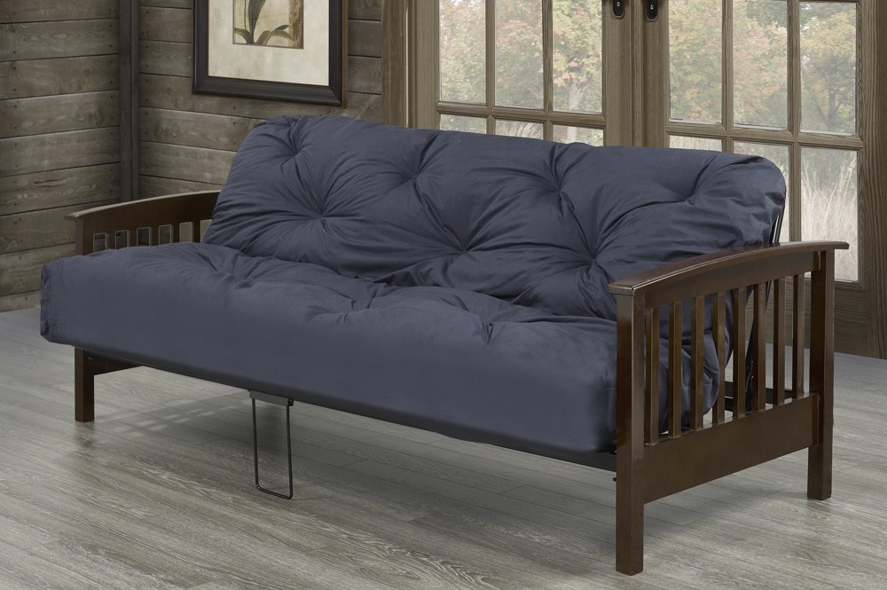 This Futon with solid wood espresso arms and metal body will make a stylish and sturdy addition to your home.