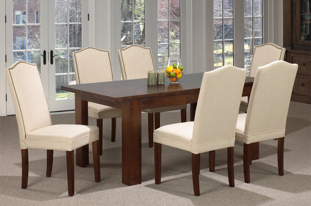 The simplicity of this dining room will make anyone feel comfortable. Chairs are upholstered in lovely beige linen-style fabric with brass nail head studs and accented with gorgeous walnut legs. The warm walnut finish gives this table a contemporary feel yet the simplicity of this set will make anyone feel comfortable. Features a 12 leaf which will allow for plenty of space for friends and family.