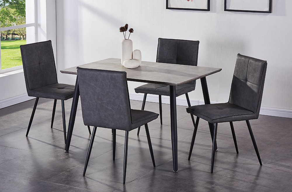 This modern design dining set is sure to impress with its concrete look table top and sturdy metal legs. Chairs include light tufting and are draped in grey air suede fabric.