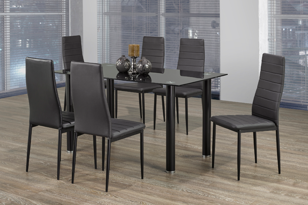A classic, simple and affordable 7 piece dining set features black tempered glass.