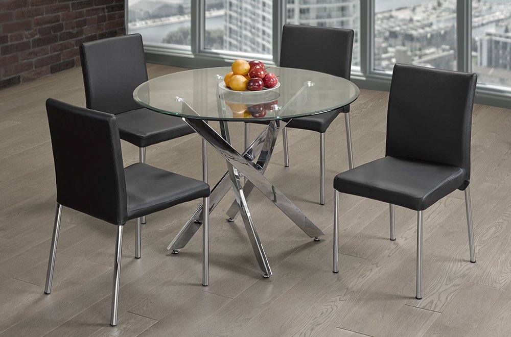 This clean and modern designed dining set includes a round glass table with unique, cross-hatch legs in a chrome finish, as well as comfortable, modern design chairs. The contemporary dining chairs include black leatherette seating with chrome finish metal legs.