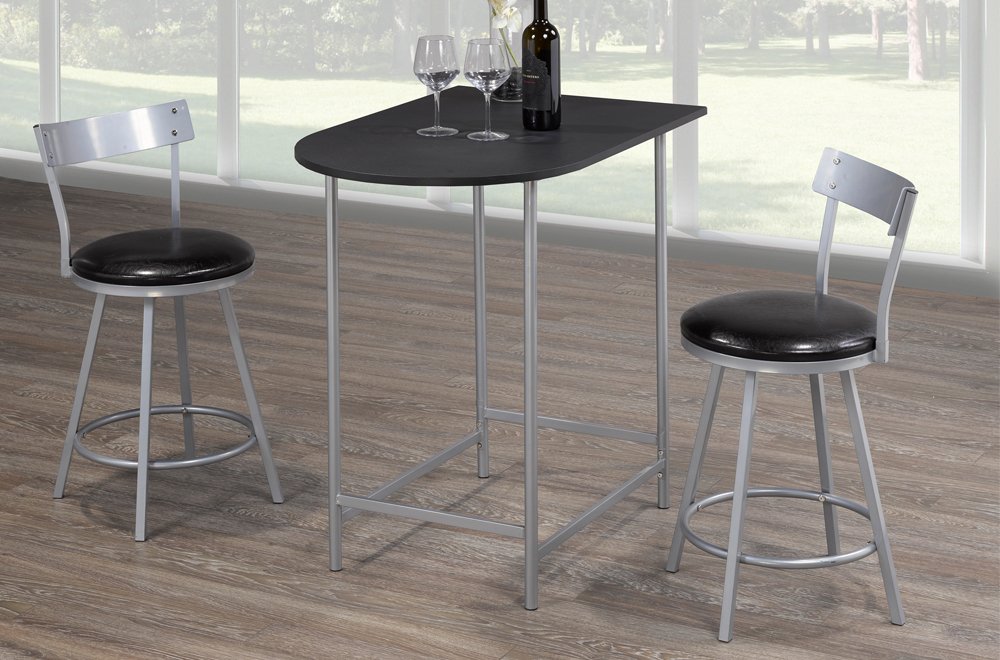 The perfect small spaces solution! This pub set includes 2 chairs with swivel seating, and comfortable, black, faux leather seats. The table is cut to fit perfectly against a wall, and includes bottom supports for greater stability. Set comes with table and 2 chairs.