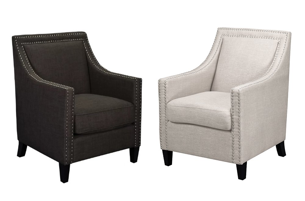 The perfect way to compliment any room with comfort and elegance. Featuring a modern and contemporary design, use this chair as an accent piece in any living or bedroom. Available in charcoal or grey linen fabric, and with accented silver nail heads.