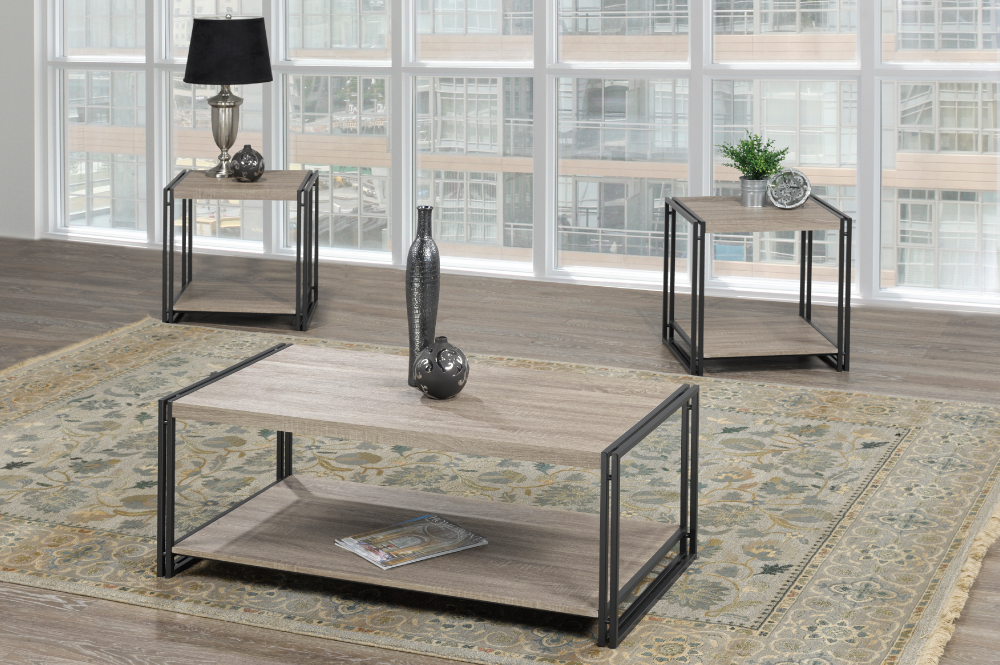 Make a statement with this distressed grey wood finish, and black finished, metal frame coffee table set. Magazine shelves on both coffee and end tables, provide plenty of extra storage space.