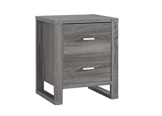 Create a stylish and functional bedroom space with the addition of this versatile nightstand. Its neutral grey finish fits seamlessly into your existing d?cor for a polished look you’ll love. A unique base design adds a contemporary edge while still maintaining a sense of classic style. Featuring two handy drawers, this nightstand can help you reduce clutter in your bedroom by providing storage space for reading materials, remotes and other small items. Brushed silver hardware completes the handsome look and allows for easy opening and closing of the storage drawers.